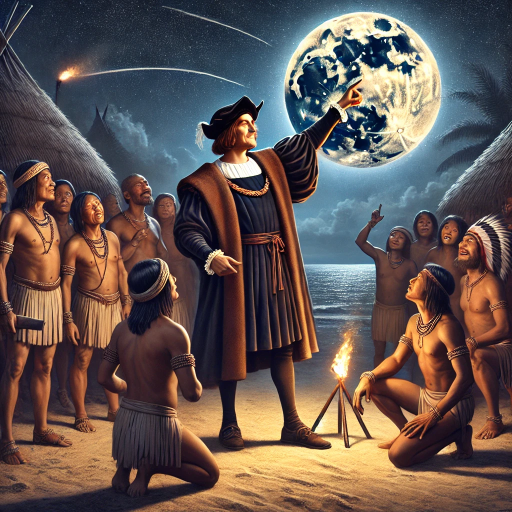 Imagen generada por IA sobre Colón, el eclipse y los nativos de Jamaica.